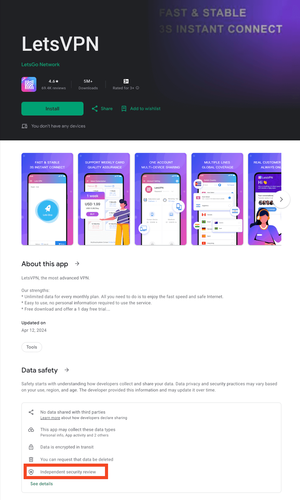 Google 专门将独立安全审核徽章展示在应用商店首页,帮助 Android 用户更容易识别安全可靠的 VPN 应用程序,突破了依靠下载排名和用户评论作为标准的传统筛选方式,杜绝了因虚假下载量和评论操控导致下载到不安全应用的再情况发生。